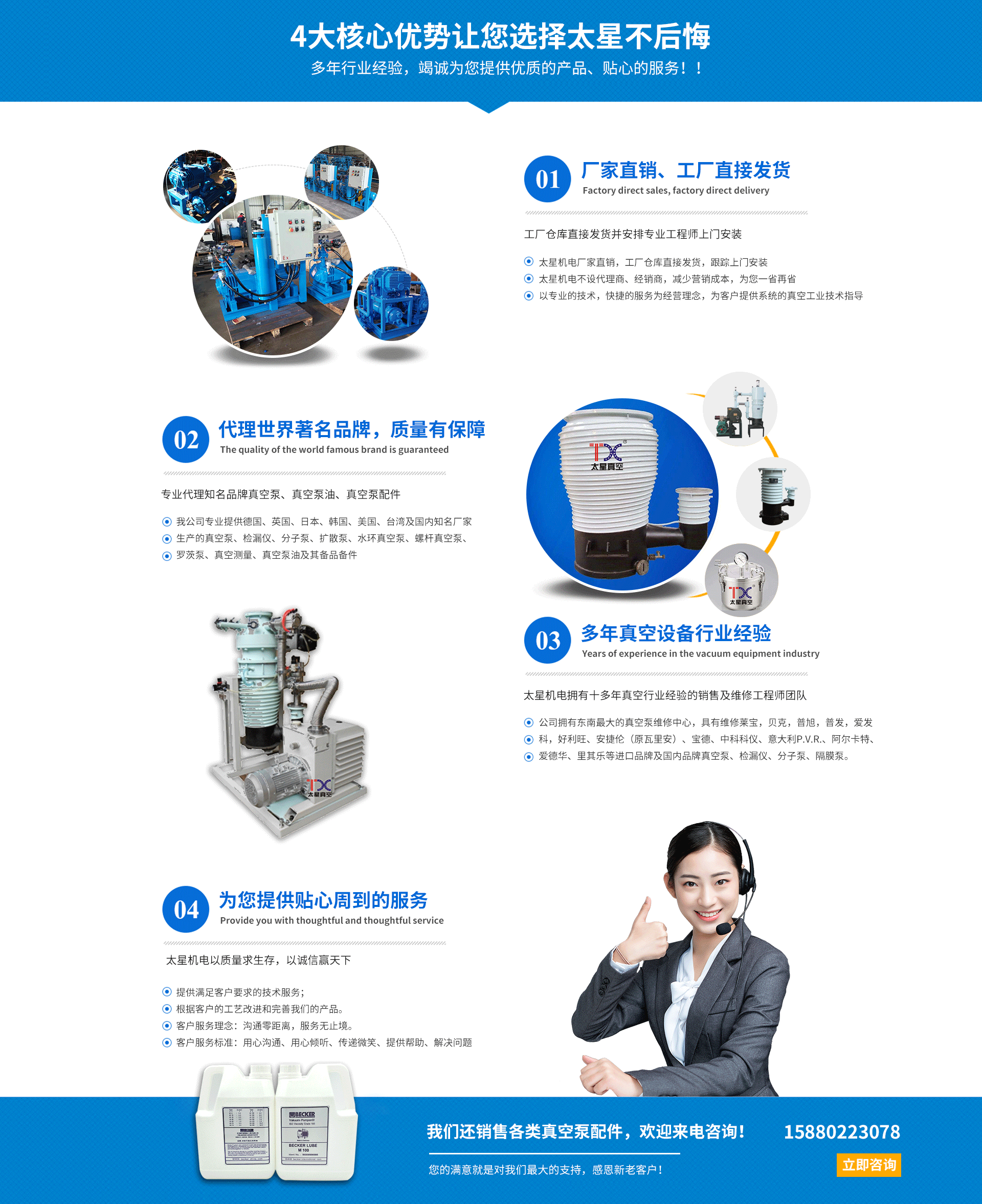 廈門(mén)太星機(jī)電有限公司于2009年成立于廈門(mén)集美,是一家真空工業(yè)服務(wù)企業(yè)。廈門(mén)太星機(jī)電有限公司擁有一批技術(shù)維修團(tuán)隊(duì),在維修方面有精湛、豐富的技術(shù)經(jīng)驗(yàn),標(biāo)準(zhǔn)的維修車間,標(biāo)準(zhǔn)的維修工具,規(guī)范的作業(yè)流程。為客戶提供完善可靠的服務(wù),以精致維修,價(jià)格合理,提升真空設(shè)備的使用價(jià)值。 廈門(mén)太星機(jī)電有限公司真空工業(yè)銷售和服務(wù)。以技術(shù)雄厚的服務(wù)能力廣受客戶的認(rèn)可,應(yīng)用于上百家客戶,提供了優(yōu)良的服務(wù),應(yīng)客戶需求定制價(jià)值高的真空工業(yè)解決方案。 主營(yíng)范圍: 1、銷售真空泵、真空配件、真空泵油、耗材、真空部件; 維修保養(yǎng)干泵、分子泵、旋片泵、機(jī)械泵、羅茨泵、渦旋泵、氦質(zhì)譜檢漏儀、羅茨風(fēng)機(jī)、隔膜泵、柱塞泵、水環(huán)泵、真空儀器、真空閥門(mén)等真空設(shè)備; 真空系統(tǒng)的定制、優(yōu)化、改造、升級(jí)。 真空系統(tǒng)檢漏服務(wù); 非標(biāo)真空工程的規(guī)劃、設(shè)計(jì)、施工、調(diào)試、培訓(xùn)服務(wù); 3D打印機(jī)及3D打印服務(wù); 2、進(jìn)口真空泵的銷售、維修和保養(yǎng)的一條龍服務(wù),如Agilent安...